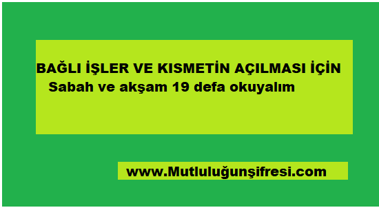Bağlı işlerin ve kısmetin açılması için sabah akşam 19 defa January 12, 2020 Original Image size: 550 × 305 Bağlı işlerin ve kısmetin açılması için sabah akşam 19 defa Bağlı işlerin ve kısmetin açılması için sabah akşam 19 defa Bağlı işleri açmak-kısmeti açmak için sabah akşam 19 defa okunacak Dua