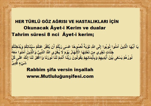 Her türlü göz ağrısı ve hastalıkları için tahrim süresi ayeti kerim ve dualar December 4, 2017 Original Image size: 500 × 350 Her türlü göz ağrısı ve hastalıkları için tahrim süresi ayeti kerim ve dualar Her türlü göz ağrısı ve hastalıkları için tahrim süresi ayeti kerim ve dualar Göz ağrısı ve göz hastalıkları için okunacak Âyet-i Kerim ve dua