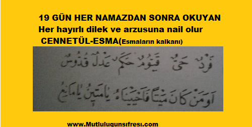 19 gün cennetül esma ile dua her arzu ve istek her sıkıntı September 17, 2017 Original Image size: 500 × 252 19 gün cennetül esma ile dua her arzu ve istek her sıkıntı 19 gün cennetül esma ile dua her arzu ve istek her sıkıntı Her hayırlı murat-her sıkıntı ve hastalık için “Cennetül Esma’dan bir dua”