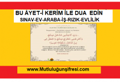 iş-rızık-ev-araba-Hayırlı evlilik-Sınav başarısı için okunacak önemli bir Âyet-i kerim Kul bazen istediği şeyin hayırlı mı değilmi bilemez.O yüzden duasını edder eğer Rabbine bırakırsa,Yüce Rabbimiz onun hakkında hayırlı olanı mutlaka nasip eder. Yüce Rabbimizden (Ev-Araba-iş-rızık-hayırı bir evlilik) isteyeceğinizde,aşağıdaki Âyet-i Kerimi her gün...