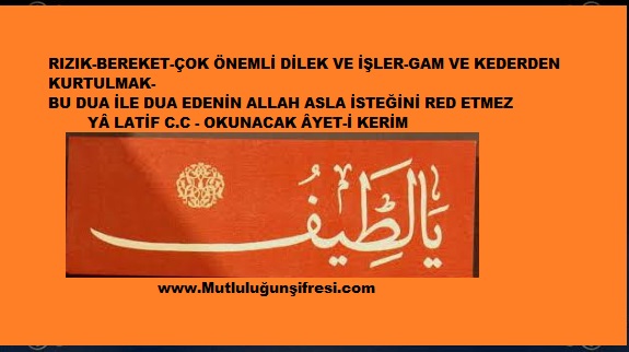 Çok önemli Ya Latif duası ( Rızık-Bereket-Hayır-önemli işler) January 22, 2020 Original Image size: 575 × 322 Çok önemli Ya Latif duası ( Rızık-Bereket-Hayır-önemli işler) Çok önemli Ya Latif duası ( Rızık-Bereket-Hayır-önemli işler) Ya Latif ve okunacak Âyet-i Kerim “Rızık-Bereket-Önemli dilek ve işler-sıkıntıdan kurtulmak”